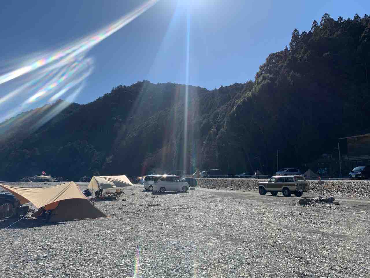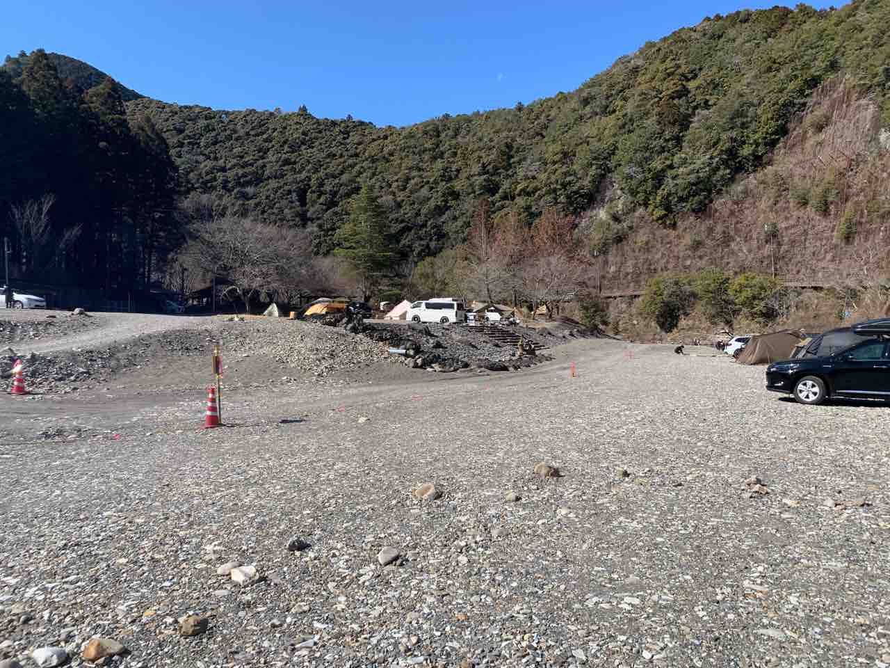 河原サイトは読んで字の如く、河原です。大部分は整地されていてフラットな場所が多いんですが、川に近づくにつれて大きな石もありました。そんな場所でもテントは張ることもできるので、当日も川の近くに何組かはテントを設営されてましたね。