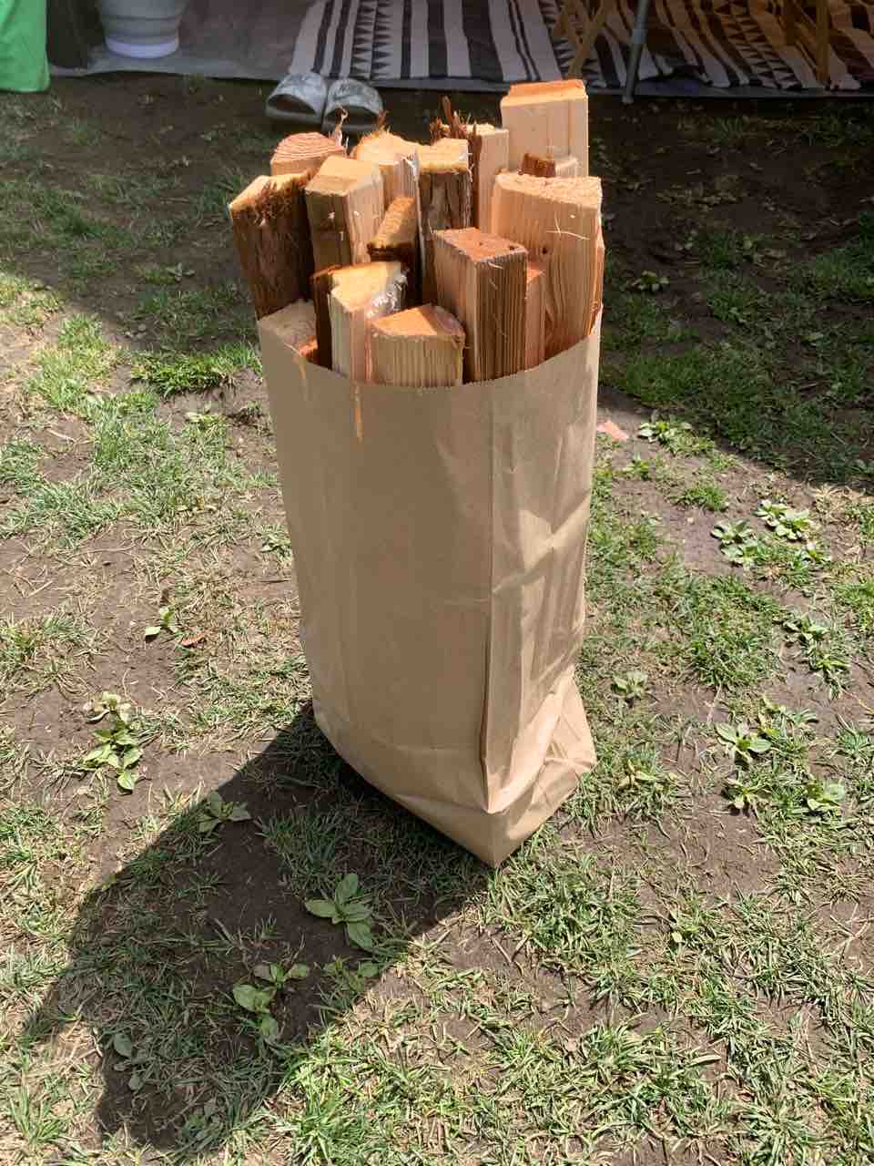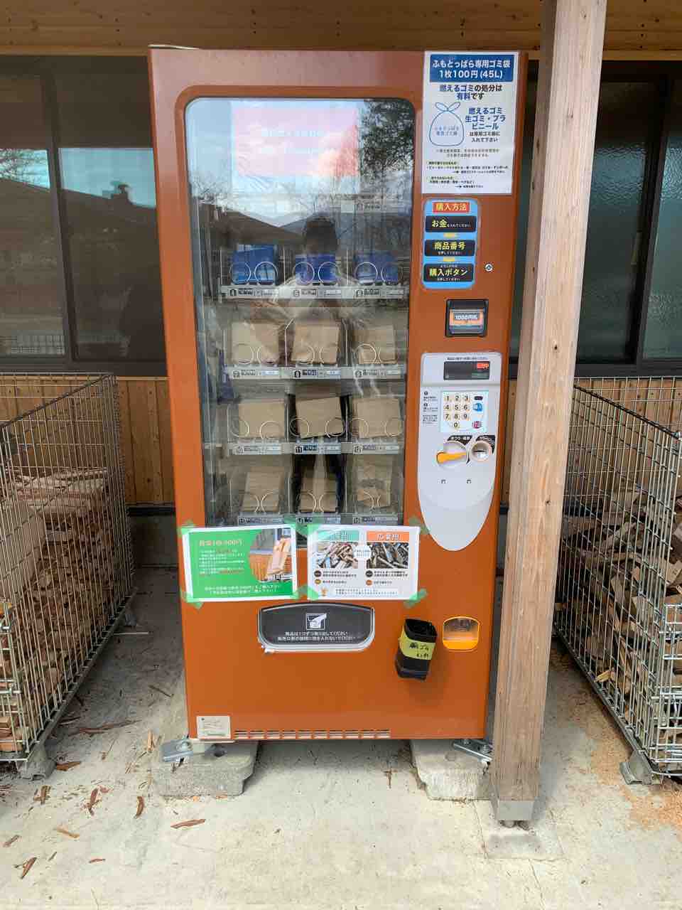 ちなみに薪の販売は他のキャンプ場ではPPバンドなどで束ねた1束いくらっていう販売が一般的だと思いますが、ふもとっぱらでは袋販売です。自販機の両側に針葉樹、広葉樹のかごがあり、袋いっぱいに入れて500円という販売方法。