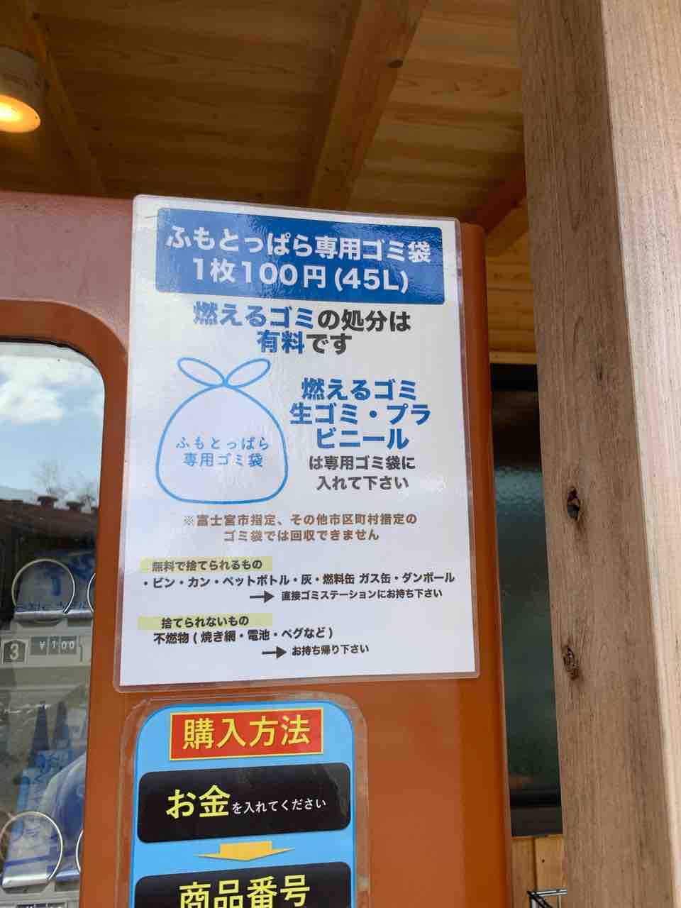 そのゴミ袋は100円で販売していて、売店、または売店横の自販機にて購入することができます。